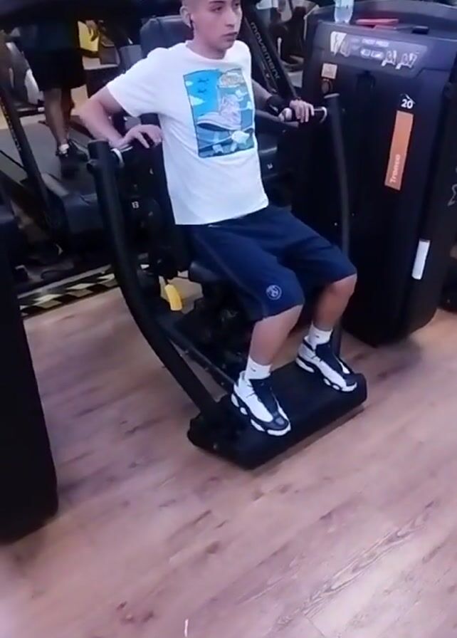 young man working out on a seated calf raise machine in a busy gym. He is wearing a white t-shirt, blue shorts, and black and white sneakers. The machine is black with a digital display and the word "Matrix" on the side. Other people can be seen in the background on treadmills and engaging in other exercises. The floor is a light brown wood. The gym appears well-lit.