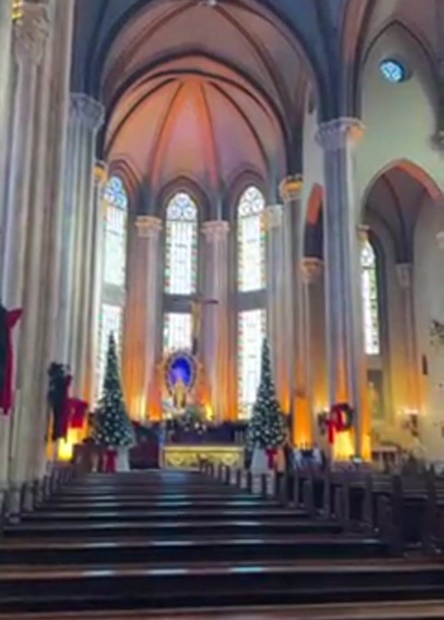 interior of a large church, likely a cathedral or basilica, decorated for Christmas. Rows of empty pews stretch from the foreground towards the altar, which is flanked by two decorated Christmas trees and adorned with red and white floral arrangements. Behind the altar, a stained-glass window depicts a religious figure. Tall, ornate columns support a high arched ceiling. Natural light streams through the stained-glass windows, illuminating the space. The lighting creates a warm glow, highlighting the decorations and architectural details. A few people are visible in the background near the altar, suggesting the space is open to visitors. A cross hangs above the altar. A single blue light is visible in the distance near the top of the left arch.