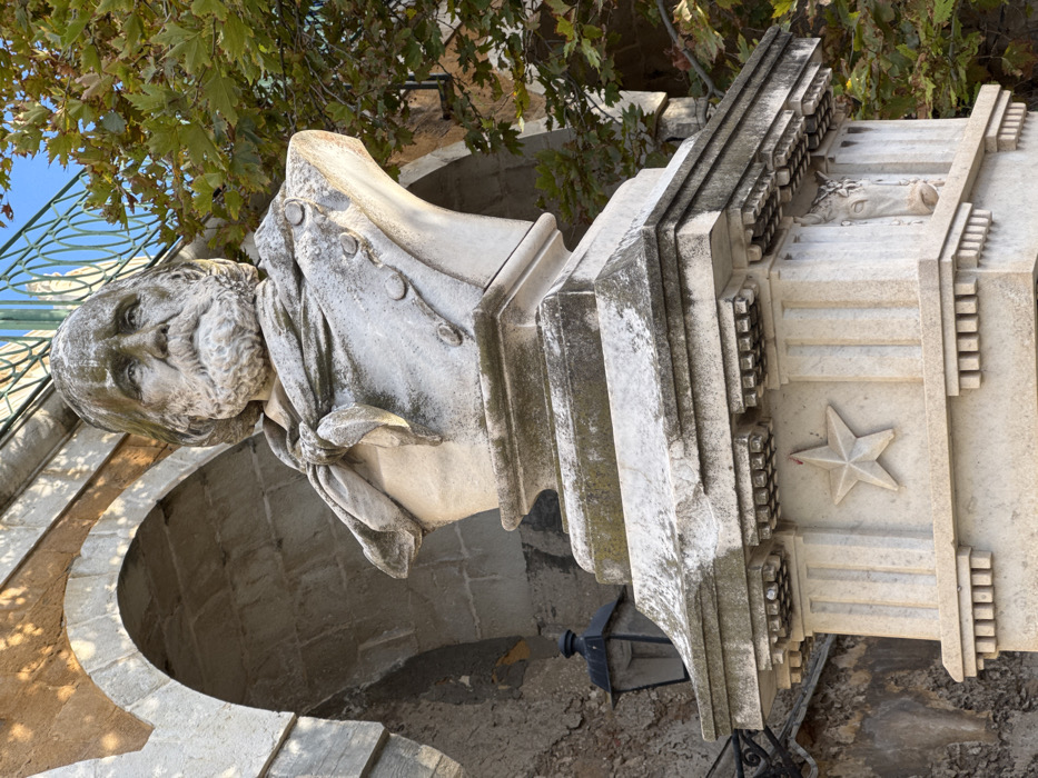 This image displays a weathered stone bust of Giuseppe Garibaldi, located in Piazza Archimede, Ortigia, Syracuse, Italy