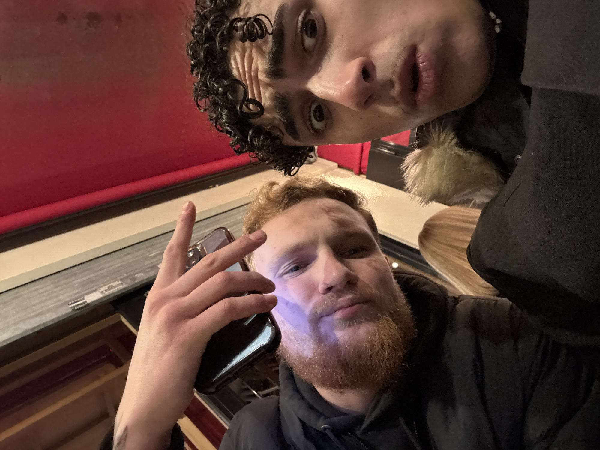 The image depicts two males posing for a selfie inside an establishment located in Paris, France; the specific address or district is not identifiable from the visual information. The male on the left exhibits fair skin, a reddish-blonde beard, and wears a dark jacket. His left hand holds a dark smartphone, emitting a blue-purple light that illuminates his lower face. His right hand is raised, with the index finger extended upward. The male on the right has fair skin, dark curly hair, a faint mustache, and wears a dark jacket with a light-colored fur-lined hood. His eyes are wide open, and his mouth is slightly agape. A third individual with blonde hair is partially visible in the lower-middle background, positioned behind the first male. The background features a large red surface, resembling an awning or a painted wall, above dark vertical paneling.