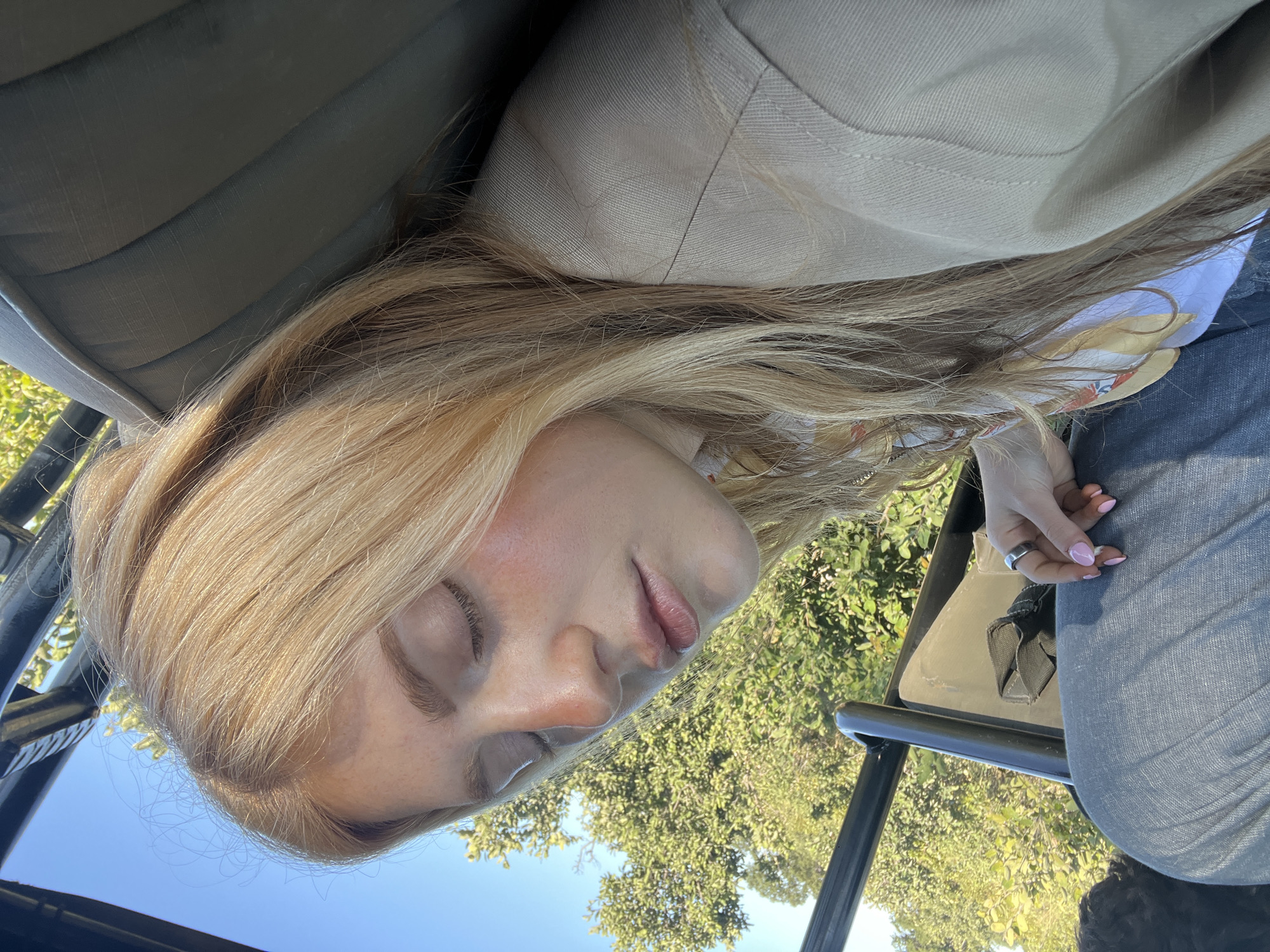 A blonde-haired woman with her eyes closed is reclined in the passenger seat of an open vehicle in Khwai, Botswana