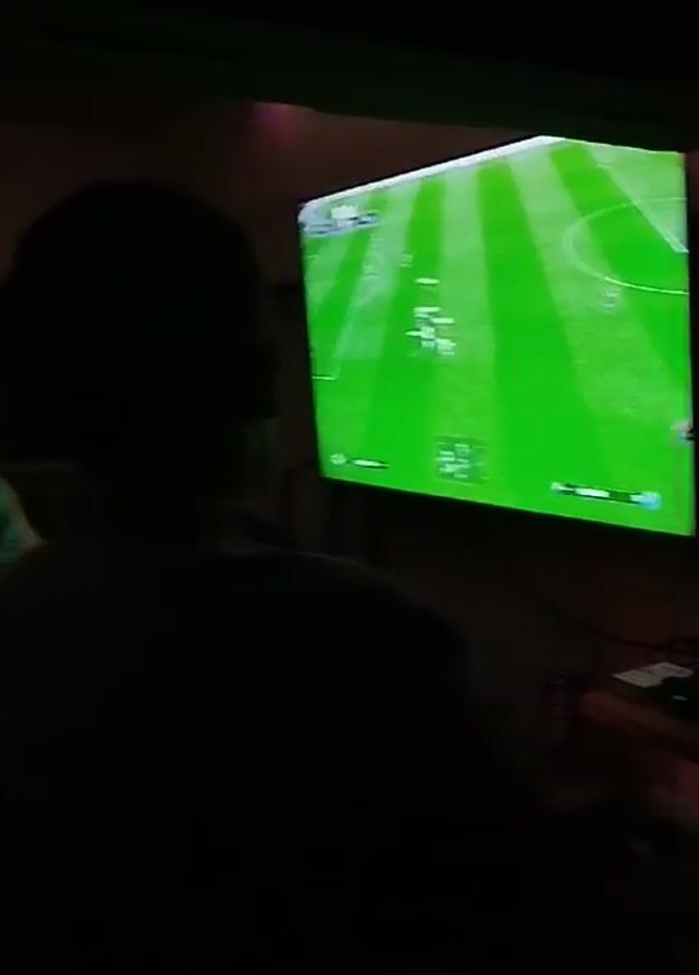 three young men playing a soccer video game, presumably FIFA, together in a dimly lit room. A fourth person's back is visible on the right. They are focused on the screen and holding game controllers. One is wearing glasses, and another is wearing a blue sleeveless shirt. There is a phone and other objects on a table to the right of the screen. The room appears to be illuminated by the light from the screen and potentially some green lighting elements. Music is playing in the background.