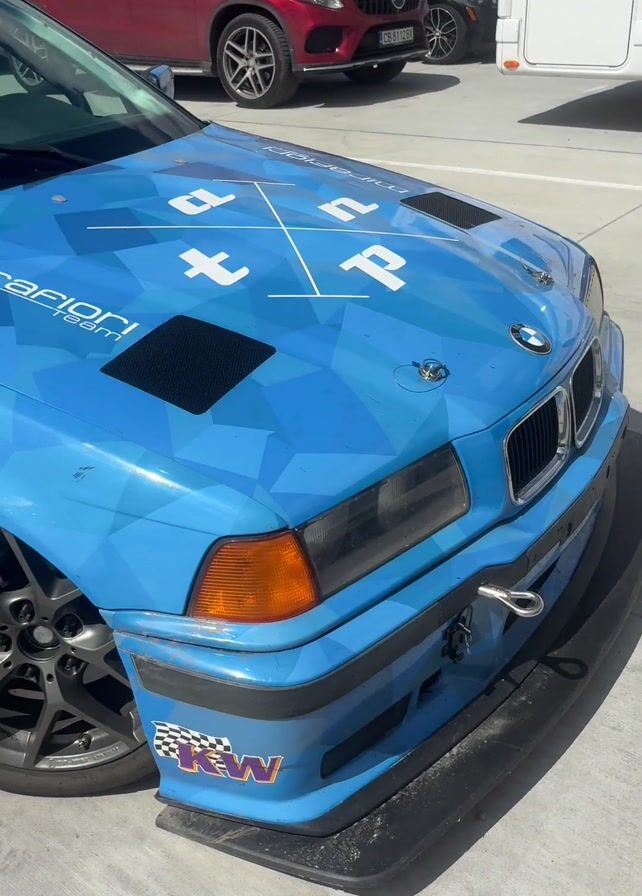 The video showcases several luxury vehicles parked in an outdoor parking lot on a sunny day. It begins with a close-up of a blue BMW with racing modifications, including a front splitter and hood vents. The camera then pans out to show a parking area filled with high-performance cars such as a bright green Porsche, a yellow BMW, and a white Porsche with a purple accent. Several other cars are parked nearby. A mountain range is visible in the background. The camera briefly focuses on two men standing near one of the vehicles. The overall atmosphere suggests a gathering of car enthusiasts at a racetrack or event venue.