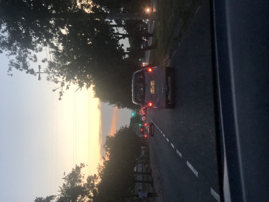 A traffic jam is captured on a road flanked by lush green trees against a vibrant sunset sky