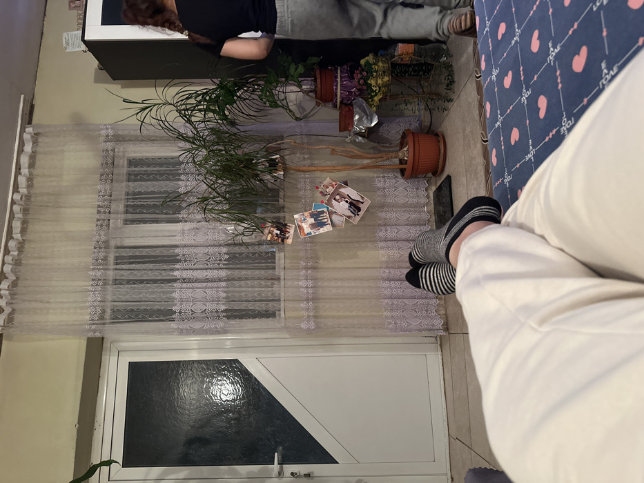 The scene depicts an interior residential room, identified as being in Marinka, Bulgaria. In the immediate foreground, the lower legs of a person are visible, clad in light-colored trousers, resting on a blue blanket patterned with pink hearts and "LOVE" text. Their feet wear mismatched socks: the left sock features horizontal black and white stripes, and the right sock exhibits black, grey, and white patterns. To the left, a white PVC door with a frosted glass panel, bisected diagonally by a white strip, is fitted with a metallic handle and lock. A window, covered by sheer white curtains adorned with ornamental lace-like patterns, occupies the central background. Approximately six small photographs are clipped to the curtains at various heights. Directly in front of the window, a tall, multi-stemmed plant, resembling a Dracaena, is potted in a brown terracotta-style pot with a saucer. Several additional photographs are clipped to the branches of this plant. To the right of the tall plant, a tiered metal stand supports several smaller potted plants and objects, including one wrapped in foil. The floor throughout the visible area is tiled. On the far right, a person stands facing away from the viewer, wearing a black short-sleeved top, grey sweatpants, and open-toed sandals. Their dark hair is partially visible. A dark-colored cabinet with a visible white door segment is situated behind this person, topped by a small decorative item. A dark mat is present on the tiled floor near the base of the tall plant. A plastic bottle is visible on the floor to the right of the tiered plant stand.