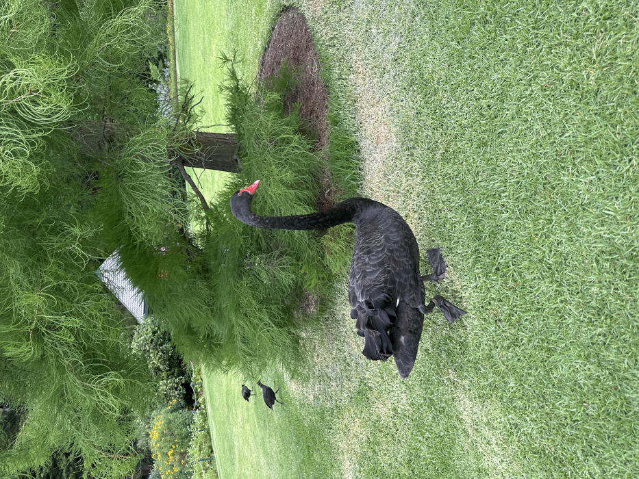 A black swan stands on a green lawn, its neck arched elegantly. The swan is partially obscured by a tree with feathery green foliage. Two smaller, dark-colored birds, possibly chicks, are visible in the background, slightly to the left of the swan. The lawn is neatly trimmed, and a mulched area borders the tree. In the distant background, hints of a building and various greenery can be seen.
