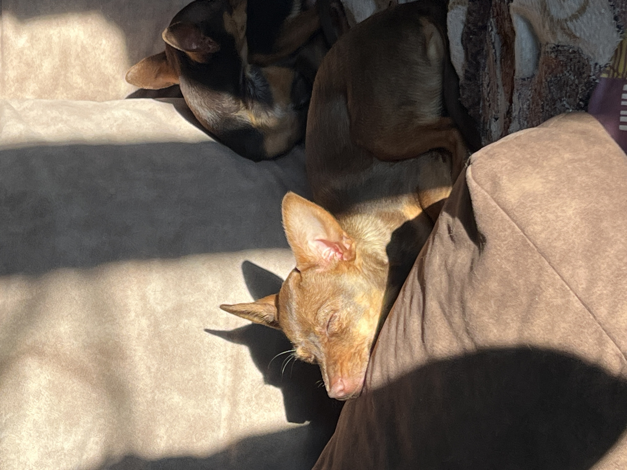 Two dogs are asleep on a tan dog bed. One dog is brown and tan, with its head resting on a brown cushion. The other dog is black and brown, and is curled up behind the first dog. Light shines on the bed and dogs.