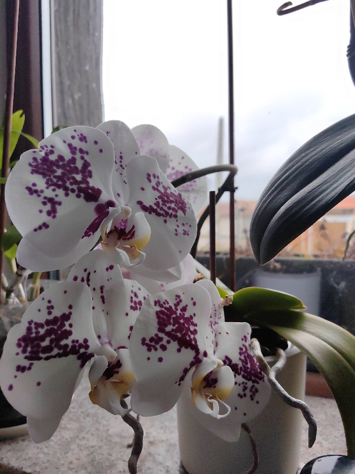 An indoor scene in Saedinenie, Bulgaria, displays a blooming Phalaenopsis orchid plant positioned on a gray, speckled surface, likely a windowsill or counter. The foreground is dominated by several white orchid flowers, each adorned with numerous dark purple speckles and a central labellum exhibiting yellow and purple coloration. Dark green orchid leaves are visible on the right, along with twisted, exposed roots and a thin, dark support stake. The plant is situated in a light-colored pot, partially visible at the bottom right. The background features a large window opening to an overcast sky. Through the window, the faint outlines of distant buildings and a tall, slender, light-colored structure are discernible. No people are present.