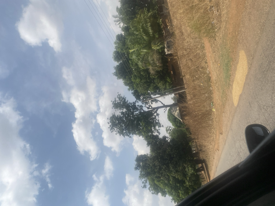 The image depicts a daytime, outdoor scene in Tataura, Nigeria, captured from the perspective of a vehicle, evidenced by the dark frame of a car door and side mirror in the lower left quadrant. A paved road surface with minor cracks is visible in the foreground, transitioning to a dirt shoulder on the right. On this shoulder, a patch of light yellow, granular material, consistent with dried grains, is present. The roadside is populated by dry, light brown grasses and sparse green vegetation. In the middle ground and background, a dense assortment of green trees, including broadleaf and palm varieties, dominates the landscape. A single-story structure with a light-colored roof is partially obscured by trees in the mid-distance. Utility poles with overhead lines are visible on the right side of the frame, interspersed among the trees. The sky is clear blue with numerous scattered white cumulus clouds. No individuals or animals are visible.
