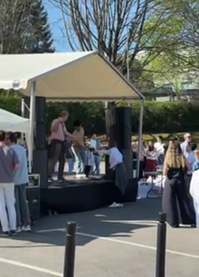 small outdoor stage set up in a parking lot with a crowd of people gathered around. A man stands on the stage speaking into a microphone. Another person stands nearby on the stage, and others are seen stepping onto and off the stage. The crowd seems to be enjoying the event, with some people cheering. There are tents set up near the stage, and trees can be seen in the background. The sky is clear and blue, suggesting a sunny day.