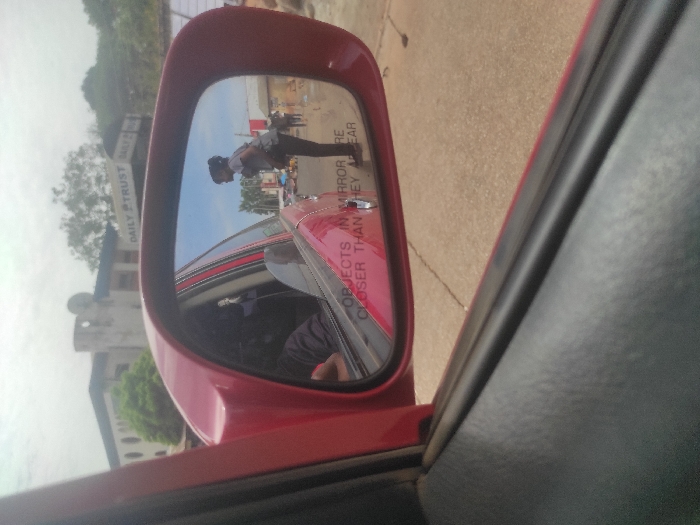 The image is captured from the passenger compartment of a red vehicle, showing a black textured interior door panel and the vehicle's red exterior leading to the side mirror