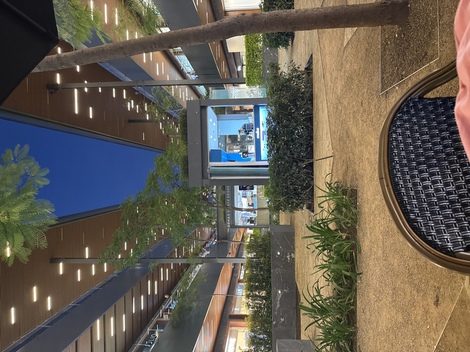 This image depicts a modern, open-air shopping mall at dusk or night, located within Antea LifeStyle Center in Santiago de Querétaro, Mexico. The perspective is low, seemingly from a seated position, with the top of a black and brown woven patio chair visible in the immediate foreground, partially obscuring a peach-colored fabric. The scene is dominated by a central pedestrian area paved with light brown gravel, flanked by manicured landscaping. In the midground, several low planting beds contain varied green foliage, including spiky plants in the foreground and denser bushes further back, set in dark grey stone planters. Multiple slender trees with green leaves are distributed throughout the gravel area. A prominent, thick tree trunk stands on the right side, extending vertically with branches visible at the top right. Centrally positioned, slightly to the right, is a contemporary, glass-enclosed kiosk with a brightly lit interior in shades of light blue. A male individual, wearing a dark shirt and cap, is visible inside, working behind a counter displaying "mabe" branding. Text partially visible on the kiosk's exterior reads "DONAS Y CAFÉ DESDE." Two multi-level structures frame the central pathway, featuring dark grey or black facades and ceilings with light brown or wooden panels. Numerous rectangular recessed lights illuminate the undersides of these structures and balconies. Storefronts are visible along the ground level, with illuminated interiors and signage. "JULIO" is clearly visible on a store sign on the left side, and a partial "AMERICAN" (likely American Eagle) sign is visible further down. Indistinct figures of individuals can be observed on the upper levels and ground floor of the mall. The sky above the structures is a clear, deep blue, indicative of evening.
