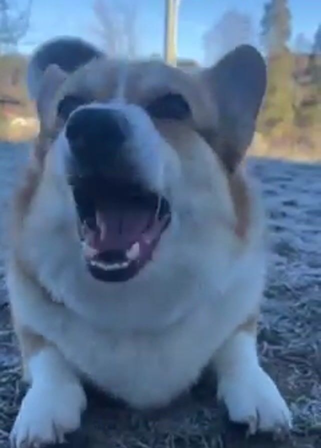 corgi sitting on a frosty field with a church steeple visible in the background. The dog is barking and wagging its tail. The sky is blue and a streetlight is visible in the distance.