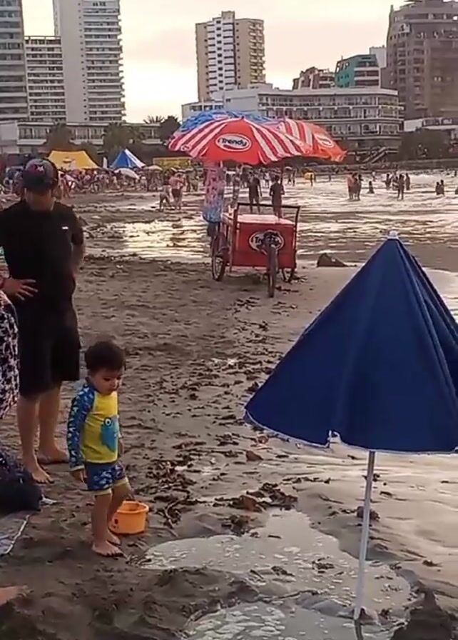 sandy beach with wet sand, several people and some structures. In the foreground, a young child with a small yellow bucket stands near a blue umbrella. Further out in the water, several people are swimming and playing with a red ball. In the background, there are tall buildings and other beach umbrellas. An ice cream cart is also visible. The weather appears overcast.