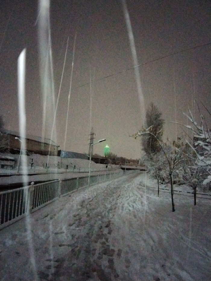 The image depicts a snow-covered urban environment in Tashkent, Uzbekistan, under dark, likely night or pre-dawn conditions. A pedestrian pathway, thoroughly imprinted with human footprints, dominates the foreground, extending into the mid-ground. To the left of the path, a light-colored metal railing runs parallel to a visible canal or water channel, beyond which a low embankment supports several snow-dusted buildings. A tall utility pole with a streetlamp, emitting a yellowish-green light, is positioned near the canal. To the right of the path, multiple deciduous trees stand with snow-laden, bare branches. In the background, the distinctive Tashkent TV Tower is prominently visible, illuminated with green light against an overcast sky. Faint vertical light streaks, indicative of falling snow reflecting flash, are present throughout the upper portion of the frame. No individuals are present, but the footprints confirm recent human activity on the pathway.