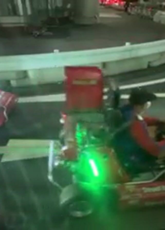 group of people driving go-karts on a street at night. The go-karts are red, with the words "Street Kart.com" and Japanese writing visible on their sides. Each kart has a delivery box attached to the back. The go-karts are equipped with green lights underneath. The drivers are wearing various costumes, including yellow and green. The street is dark, with streetlights providing illumination. A white guardrail lines the edge of the road. There is a building in the background. The go-karts drive around a corner.