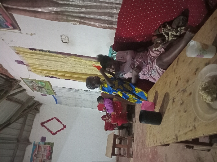 A woman in a blue and yellow dress styles a girl's hair. Several other people are in the room. A wooden table is laden with a plate of food, a black cylinder, a pink container, and a white plastic bag. A bed with a red patterned cover is in the background. The room has decorations, including a yellow curtain, pictures, and a floral diamond shape. A roof with visible beams and wooden supports is evident.