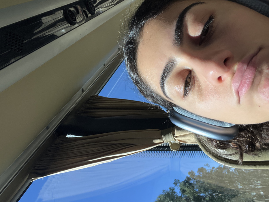 The image displays a close-up, upward-angled view of a young individual, likely female, situated inside a vehicle identified as being in Aveiro, Portugal. The individual has dark, curly hair and an olive skin tone, exhibiting a visible sheen on the forehead and cheeks from direct sunlight. Grey Apple AirPods Max headphones are worn over the ears. The eyes are partially closed or squinting, suggesting a state of rest or drowsiness, with the right eye (viewer's left) revealing a brown iris. The lips are full and slightly parted in a relaxed expression. To the left of the individual, a vehicle window reveals a clear, bright blue sky containing a faint white contrail and distant green tree foliage. Beige pleated curtains frame the window. The vehicle's interior ceiling is visible in the upper right, featuring an off-white panel with integrated air vents or lights. The scene depicts a daytime travel setting under clear skies.