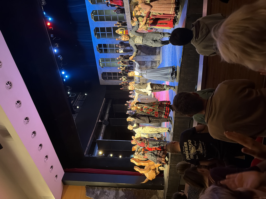 The image depicts a curtain call on a theater stage in Plovdiv, Bulgaria