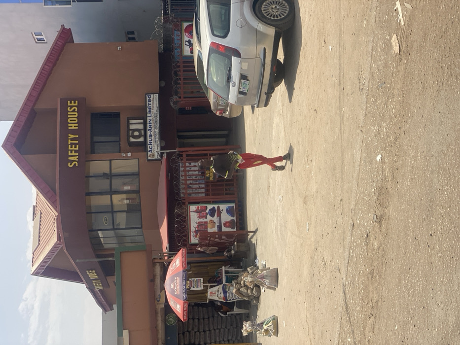 The image depicts an outdoor street scene in Shaba, Nigeria, under a bright, sunny sky. In the center, a prominent two-story commercial building, labeled "SAFETY HOUSE" in yellow lettering on its reddish-brown facade, dominates the background. The building features large, dark-tinted windows on the upper floor and a red-tiled roof. Below the "SAFETY HOUSE" sign, an outdoor air conditioning unit is mounted, and a separate sign for "ACHUS-ARIN LIMITED" is visible, advertising corporate safety solutions. The building entrance is secured by a red metal gate topped with barbed wire, behind which posters display various safety equipment such as fire extinguishers and hard hats. A "NO PARKING" sign is affixed to the gate. The foreground consists of an unpaved, uneven dirt and gravel ground with scattered debris. A man wearing a dark t-shirt and red athletic pants with yellow accents walks left-to-right across the mid-ground, holding a white item in his left hand. To his right, the rear of a silver Ford Focus station wagon, bearing a Nigerian license plate, is parked. Another vehicle is partially visible behind the Ford. To the left of the scene, under a red "Glo Dangote Cement" branded umbrella, is a makeshift vendor stall. Stacks of cement bags are visible behind the stall, and several individuals are seated in white plastic chairs. The stall displays various items and a sign that reads "AVAILABLE HERE." Three loosely wrapped bags, possibly containing goods, are placed on the ground in the lower-left foreground.