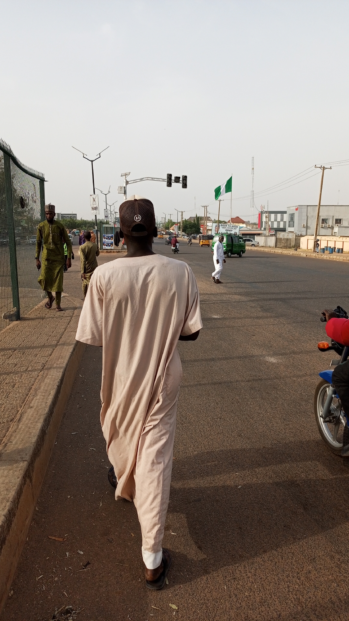 The image is taken in the city of Hayin Banki, Nigeria. In the foreground, a person wearing a long, light-colored traditional garment and a brown cap is walking away from the camera on the side of a road. To their left, a man in a green robe walks on a raised sidewalk next to a green fence. Further down the road, another person in a brown robe is walking in the same direction. Across the road, a person in white is walking, and a green van is parked. A motorcycle is parked on the edge of the road, partially visible on the right side of the frame. In the background, there is a Nigerian flag and a building. Streetlights and traffic lights are also visible. The road appears to be paved. The sky is light and overcast.