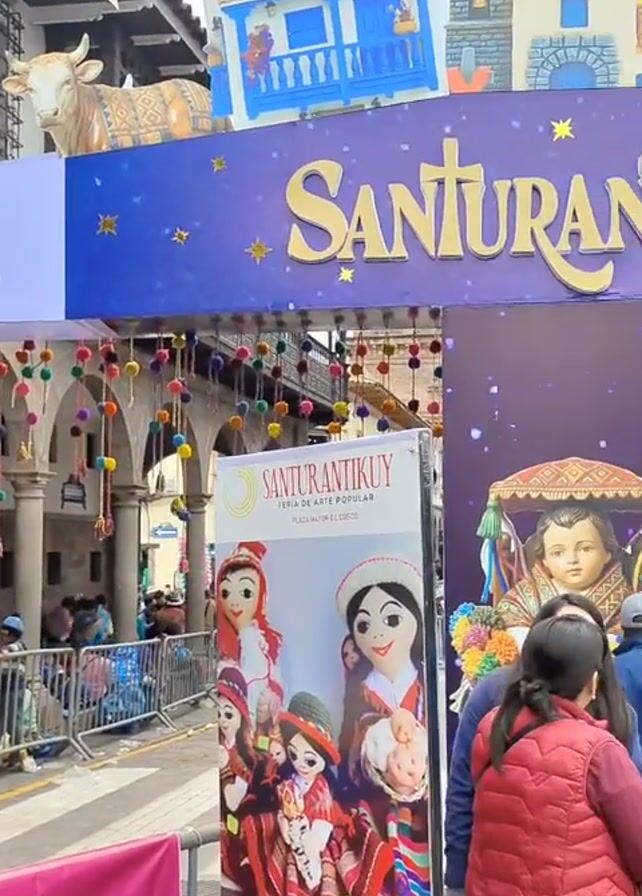 crowded entrance to the "Santurantikuy" fair in Cusco, Peru. People are walking through an archway decorated with colorful pompoms, stars, and figurines of animals and houses. There are promotional posters on either side of the archway showcasing dolls and religious figures. The fair appears to be taking place in a historic plaza with arched walkways. The video focuses on the movement of people passing through the entrance.