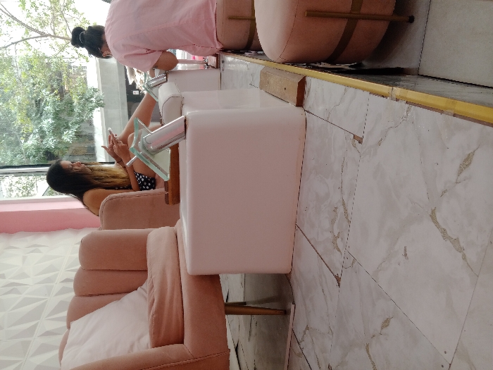The scene depicts the interior of a modern beauty salon, situated in an urban environment within Buenos Aires, Argentina. Two adult females are present. On the left, a client with long dark hair, wearing a dark polka-dot dress or top, is seated in a plush, pink upholstered armchair. She is actively using a white smartphone held in both hands. Her bare feet are positioned on a white, rectangular pedicure station, which features a footrest and a built-in basin-like apparatus. A small, transparent glass stand or tool holder is visible on the station. On the right, a technician, seen from behind, is engaged in performing a pedicure service on the client's feet. She wears a light pink short-sleeved top and has her dark hair pulled back into a bun. Her workstation includes a partially visible pink circular stool with gold-colored legs. The salon features a clean, contemporary aesthetic with a dominant light pink and white color palette. The wall behind the client has a textured white paneling with a geometric, faceted pattern. The floor is covered with large, polished white tiles exhibiting subtle light brown or gold veining. A gold-colored metallic strip runs along the floor, demarcating a slight elevation or section. A large, clear window spans the right side of the image, offering a blurred view of outdoor urban foliage and indistinct building structures, suggesting a street-level or elevated position.