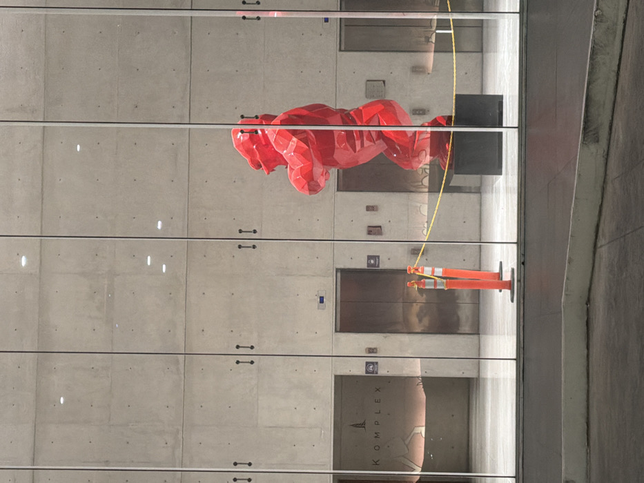modern building facade featuring a large glass window with metal supports. Inside, a red polygonal sculpture of a person in a crouching or jumping position is visible. Behind the sculpture is a gray concrete wall with several elevator doors and signage. A yellow rope is draped across the scene, and orange traffic cones are reflected in the glass. A portion of a street or sidewalk is visible on the right side of the frame.