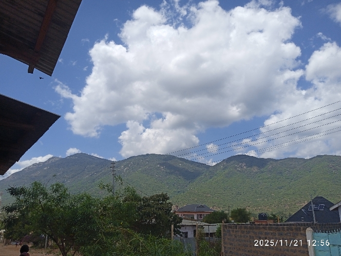 The image depicts a wide-angle view of Namanga, Kenya, on 2025/11/21 at 12:56. The prominent background features green, heavily vegetated mountains under a bright blue sky with scattered white cumulus clouds. In the immediate foreground, the upper left displays two converging sections of dark, sloped roofing material, with a small dark bird in flight between them. A human subject, visible from the head and shoulders, with dark hair, stands partially obscured in the lower-left foreground, facing towards the left. The mid-ground contains dense green foliage from various trees and shrubs. Several residential structures are visible, including a multi-story building with a light facade and dark roof on the left and a building with a steep, dark, angular roof and light walls on the right. A dark water storage tank is situated on a rooftop in the mid-ground. A utility pole and several horizontal utility lines traverse the upper mid-ground, extending across the mountain range. The lower right foreground is dominated by a low masonry wall constructed of light-colored bricks or blocks, behind which a section of a blue metal gate or fence is visible.