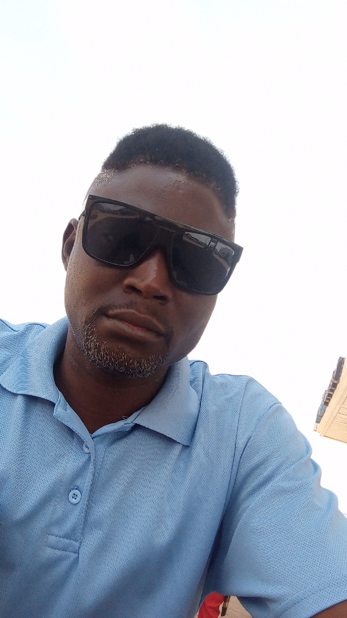 A male individual is depicted in a close-up portrait, framed from the chest up against a bright, largely undifferentiated background. He has dark skin, short dark hair styled with a fade, and a neatly trimmed beard and mustache exhibiting visible graying, particularly on the chin area. The subject is wearing dark, rectangular-framed sunglasses. His attire consists of a light blue, short-sleeved polo shirt with a collar and a two-button placket, both buttons fastened. He maintains a neutral expression and looks directly into the camera, with his head slightly tilted. The background is dominated by a bright white sky, with a partial view of a light-colored building with a darker roofline visible in the lower right quadrant of the image. The scene is located in the city of Television, Nigeria.