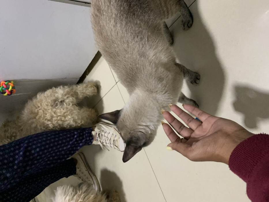 The image, captured in an indoor setting in Juan Griego, Venezuela, presents a scene involving one human and multiple animals. In the foreground, a dark-skinned human right hand, adorned with light yellow nail polish, is extended with fingers slightly parted. This hand is directed towards a cream-colored Siamese-type cat, which stands in profile, its head slightly turned towards the hand. The cat has darker points on its ears and exhibits light-colored fur. In the mid-background, the lower legs of a person are visible, clad in dark blue polka-dot pants and white canvas sneakers. Adjacent to the person's legs, the hindquarters of a light-colored, curly-haired dog are partially seen, positioned near a plain white wall. A small segment of another similar dog is visible on the far left. A colorful, spherical pet toy is attached to the white wall in the upper right portion of the frame. The floor is composed of light-colored tiles with visible grout lines.