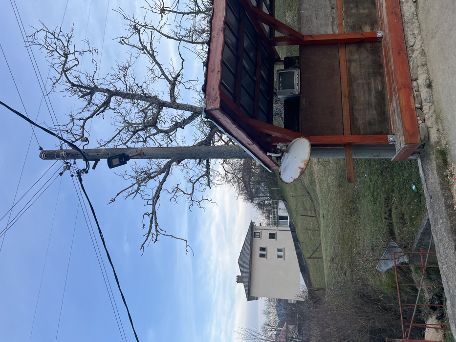This image depicts an outdoor, semi-rural scene in Paspal, Bulgaria, under a clear to partly cloudy blue sky. In the foreground, a rustic wooden shelter with a reddish-brown frame and corrugated metal roof is positioned on the right. Inside the shelter, an older model box-shaped CRT television set and additional dark objects are present on a raised platform. A rusty, white, oval-shaped object is affixed to the front left post of the shelter. A concrete utility pole, equipped with multiple power lines, insulators, and a black LED street light, stands directly behind the shelter. To the left of the shelter, a narrow ditch or stream is spanned by a rudimentary red-painted metal railing. Sparse dry vegetation and a small green plastic bottle are visible on the ground in this area. The midground features a grassy, upward-sloping hill. A two-story, light-colored building with a brown tiled hip roof and rectangular windows is situated on this slope. A concrete retaining wall and a small balcony with a white railing are visible on the right side of the building. Several large, bare deciduous trees with extensive branch networks are prominent, particularly behind the utility pole. A simple wire fence traverses the grassy incline. The background reveals additional hills with scattered trees and distant structures. No individuals are present within the scene.