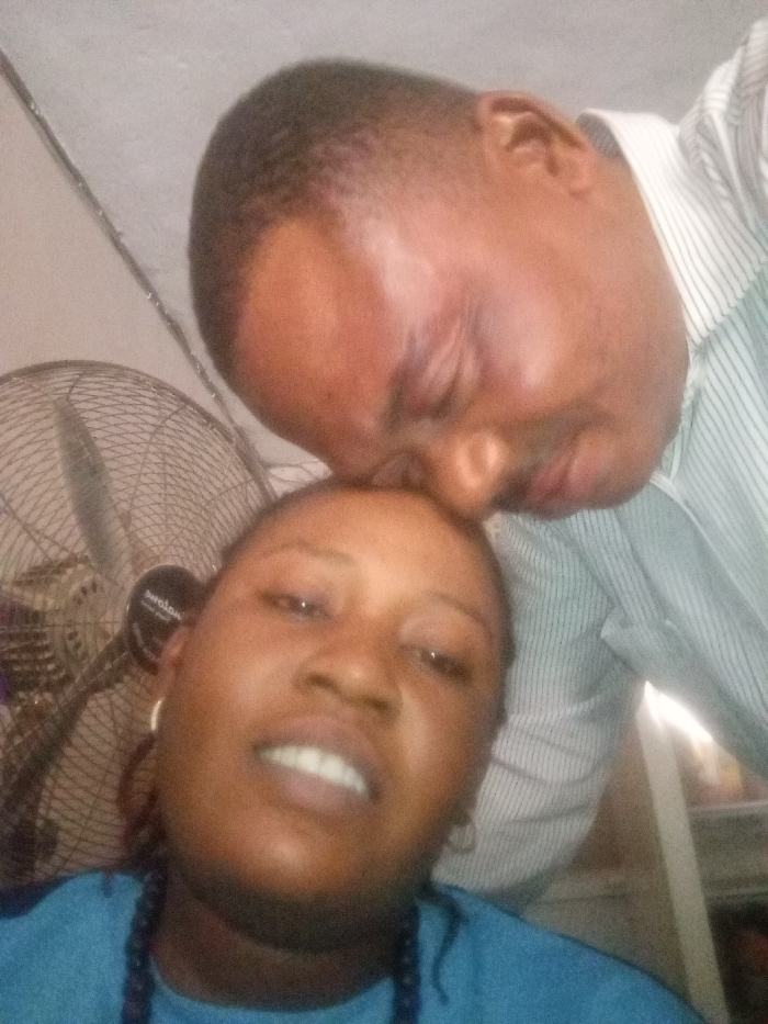 A close-up selfie features a woman and a man. The woman is in the foreground, wearing a blue shirt and a beaded necklace, with a fan slightly out of focus in the background. The man is positioned behind her, leaning in so his forehead touches hers. He wears a striped collared shirt. Both are dark-skinned with short hair, and the man's eyes are closed.