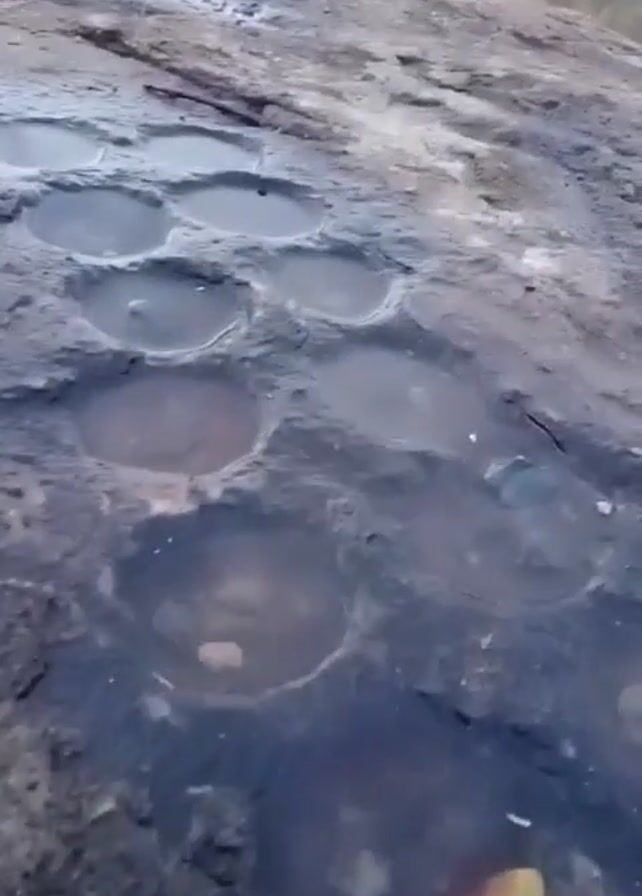 close-up view of a rock surface. The rock has several circular depressions filled with water, resembling small pools. There are some small pebbles and a single yellow leaf visible within the pools. The rock is dark in color with some lighter patches. The lighting is dim, casting shadows in the depressions. The camera moves slightly, causing the view to shift across the rock surface.