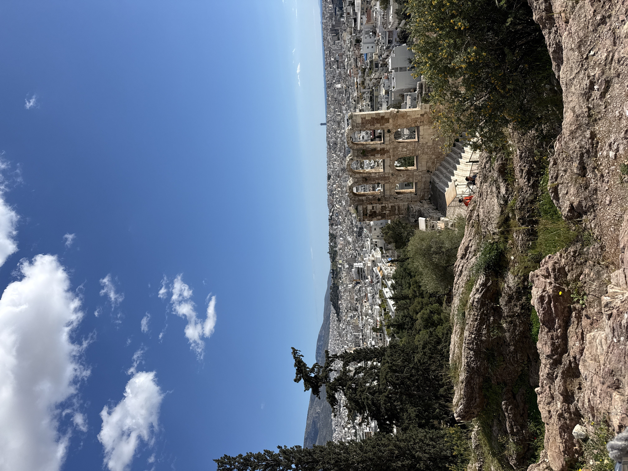 view overlooking the city of Athens, Greece. On the right side is a rocky outcrop with some vegetation. In the center is the ancient Odeon of Herodes Atticus, with some visitors seated on the steps. The city of Athens extends in the background to the horizon. The sky is blue with some clouds on the left.