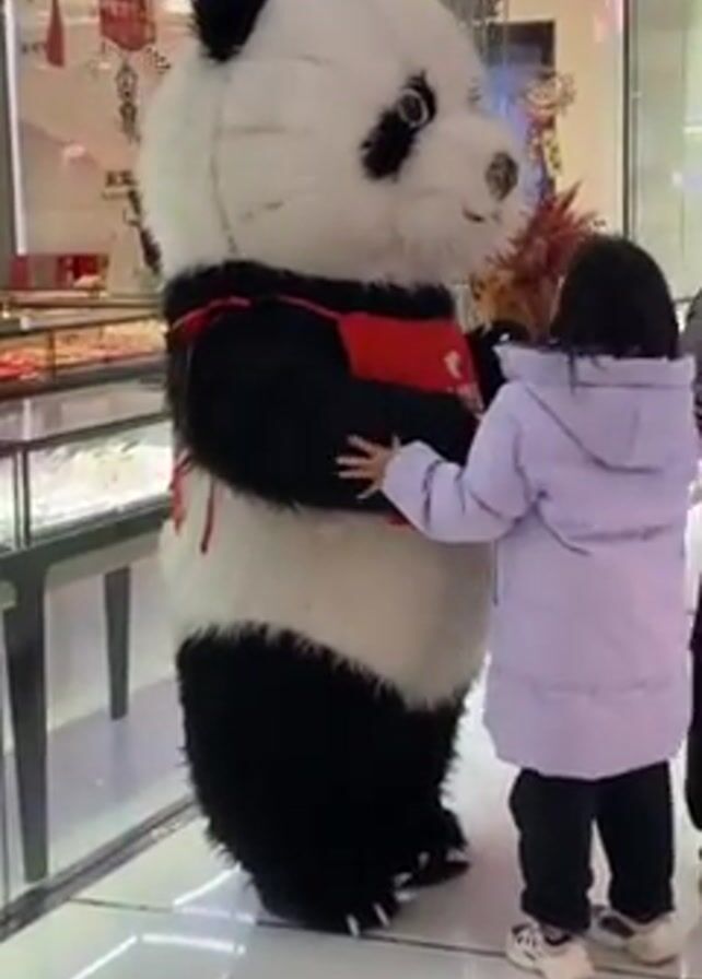 child interacting with a person in a panda costume inside what appears to be a shopping mall