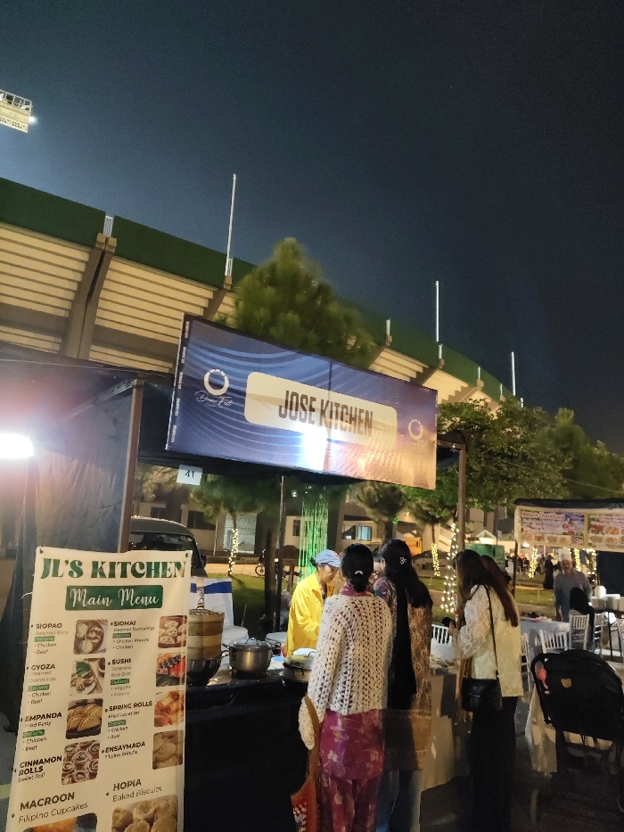 The image depicts an outdoor night scene at a food festival identified as Bana Fest, located at Jinnah Sports Stadium in Islamabad, Pakistan. In the foreground, a food stall labeled "JL's Kitchen" prominently displays a white menu board listing Filipino dishes such as Siopao, Siomai, Gyoza, Sushi, Empanada, Spring Rolls, Ensaymada, Cinnamon Rolls, Macaroon, and Hopia. A bamboo steamer and a metallic pot rest on the stall's counter. Behind this, a larger, illuminated horizontal banner reads "JOSE KITCHEN" and includes the "Bana Fest" logo. Four individuals are positioned in the immediate midground near the "JL's Kitchen" stall. One person, wearing a yellow top and a blue cap, stands behind the counter, appearing to serve three customers. These customers are primarily seen from behind, including one wearing a cream-colored knitted shawl, another in dark clothing, and a third in a white lace top. To the far right, a partial view of an additional stall, white plastic tables, chairs, and a black baby stroller are visible. The background is dominated by the large, cream-colored, multi-tiered structure of Jinnah Sports Stadium, featuring green upper fascias and numerous stadium lights. Several vertical white poles are also present. Throughout the midground, various trees are visible, some adorned with string lights. The sky is dark, indicative of nighttime, and the ground surface appears paved. A vehicle is partially discernible behind the "JL's Kitchen" stall.