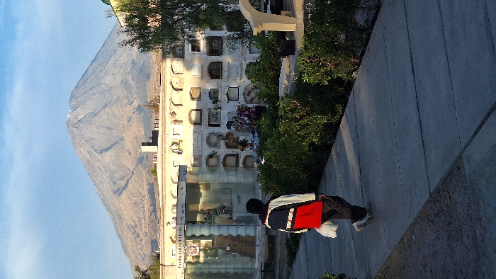 A vertical photograph depicts an outdoor scene within a cemetery in José Luis Bustamante y Rivero, Peru