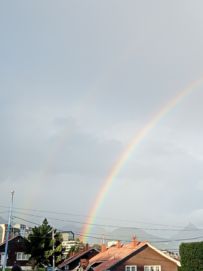 A vibrant rainbow arches across a cloudy sky, ending near rooftops. A fainter secondary rainbow is also visible. Below the rainbow, buildings with red-tiled roofs line the scene. Trees and a street lamp stand to the left. Mountains appear faintly in the background. A man is partially visible in the lower center. Power lines run horizontally across the view.