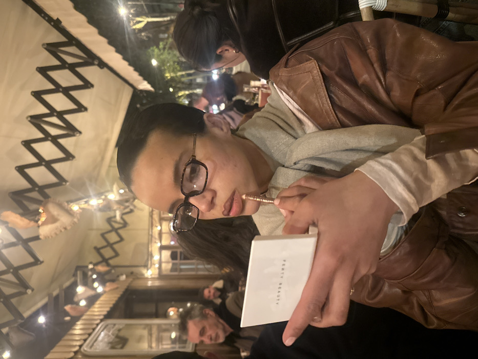 The image captures a nighttime scene within the covered outdoor seating area of a cafe or restaurant, consistent with a Parisian bistro in Paris, France. A person with short dark hair and tortoiseshell-framed eyeglasses is centered, applying makeup to their lips. They hold a white compact mirror, branded 'FENTY BEAUTY', in their left hand, reflecting their face, and a gold-toned makeup pencil in their right hand, touching their upper lip. The individual wears a brown leather jacket over a light-colored long-sleeved shirt and a light grey scarf. In the background, other patrons are visible, including an older man with grey hair and a beard positioned to the left. The environment is illuminated by warm string lights and features decorative heart-shaped hangings, wooden wall paneling, and a prominent retractable awning system overhead.
