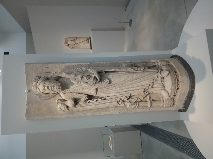 The image displays a museum gallery at the Louvre-Lens in Lens, France. In the foreground, a large, light-colored stone relief sculpture is centrally positioned on an angled white pedestal. The relief depicts a full-length, bearded male figure, presumably a saint or king, adorned with a crown and a carved halo. He wears a draped robe and holds a globular bag-like object in his raised right hand and a stringed musical instrument, resembling a medieval fiddle, in his left hand. The figure stands on an ornate, architecturally detailed base. To the right of the main sculpture, in the mid-ground, a smaller, light-colored stone sculpture of a robed standing figure is displayed on a rectangular white pedestal against a plain light gray wall. To the left, a glass display case with a white base contains a small, indistinct artifact. The floor is light gray, featuring a metallic grate running along the left side. The walls are uniformly light-colored, indicative of a modern gallery setting. A single silver-colored floor stanchion is visible in the background on the right. No human subjects are present in the scene.