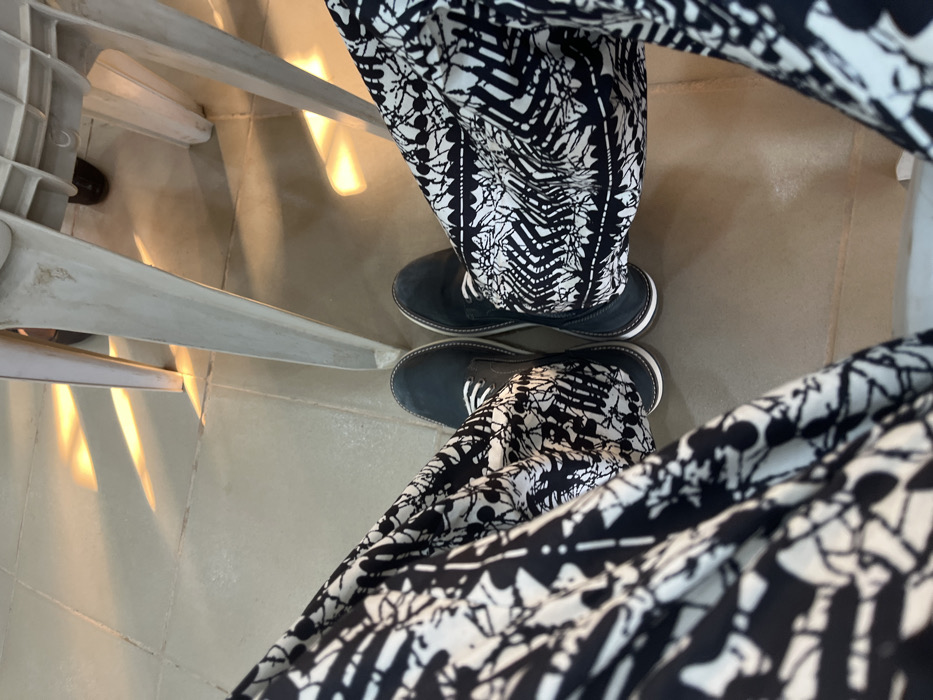 The scene depicts a first-person, downward view of a seated individual in Narayi, Nigeria. The subject's legs are clad in black and white patterned trousers, and their feet wear dark blue or black lace-up shoes with white soles. The individual is positioned on a light-colored, possibly tiled or cemented, floor. In the upper right quadrant, the lower legs of a light-colored plastic chair are visible, with a dark shoe partially visible beneath it, indicating the presence of another person or seating arrangement nearby. Multiple elongated strips of sunlight are visible on the floor, casting warm, orange-yellow light and illuminating the immediate environment.