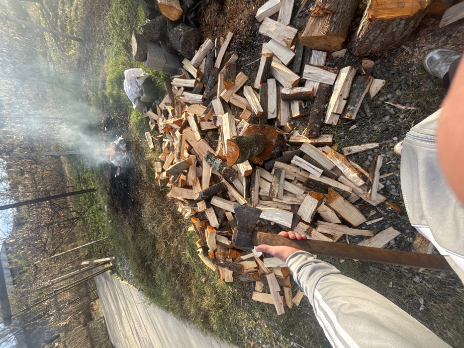 This image depicts an outdoor scene in Bulishi, Georgia, captured from a first-person, downward-angled perspective. In the immediate foreground, a right arm, wearing a light gray long-sleeved garment with three white stripes, firmly holds a double-bladed felling axe with a dark, worn wooden handle. The lower section of the individual's torso, clad in light gray athletic pants, is also visible. A substantial, irregularly shaped pile of freshly split firewood pieces, exhibiting light brown exposed wood and remnants of bark, occupies the central and right areas of the midground. To the right of the woodpile, larger unsplit log sections and stacked grey cinder blocks are present. Further into the midground, towards the center-right, a small open fire burns on a patch of blackened ground, emitting white smoke that rises into the air. A white object, possibly a bag, lies adjacent to the fire. The ground throughout the scene consists of dry grass, patches of dirt, and sparse green growth. A light-colored paved pathway runs along the left edge of the frame. The background features numerous bare trees and shrubs, with indistinct structures partially visible through the vegetation, under clear, sunlit conditions.