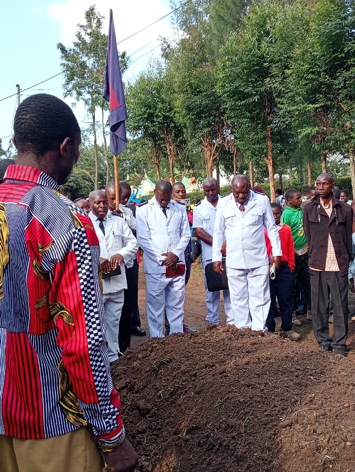 The image depicts an outdoor gathering in Lumakanda ward, Kenya, centered around a significant mound of dark brown soil, characteristic of a freshly dug grave. Approximately 15-20 individuals are visible. In the immediate foreground, the back of a person wearing a multi-colored long-sleeved shirt with red, black, white, and gold patterns, paired with tan trousers, is prominent. In the midground, a central group of approximately 6-8 adult males, predominantly dressed in white or light-colored uniforms with dark accents, stand with bowed heads, suggesting a solemn ceremony or prayer. At least two individuals in white uniforms hold small, dark books. To their right, other attendees, including adults and potentially younger individuals, observe the scene; one male on the far right wears a brown jacket. A dark blue and red flag, mounted on a pole, is visible in the left midground, positioned against a backdrop of tall, green-leafed trees. The sky is bright.