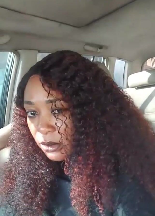 woman with curly, auburn-tinted hair inside a car