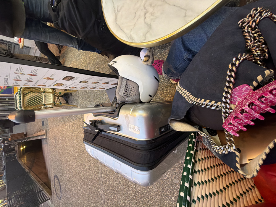 The image depicts an outdoor seating area on a paved urban street, identified as being in front of "Roll's Signature" at 3 Rue des Cordeliers, Annecy, France. In the immediate foreground, to the bottom left, is a portion of a red upholstered seat next to a woven beige and green basket-like object. To the right of this, a dark blue suede-like bag with a silver chain trim is visible, containing a bright pink, patterned hair clip. Adjacent to the bag, a person's legs clad in blue jeans are visible, with one foot wearing a bright pink shoe or slipper, and a light-colored, possibly fur-lined, slipper or item nearby. A white marble-patterned tabletop with a gold rim occupies the right side of the frame, suggesting a cafe table. In the midground, a silver hardshell suitcase with black straps and a partially extended handle stands upright on the pavement. A white sports helmet, possibly a ski helmet, is attached to or resting against the suitcase handle. Directly in front of the suitcase, a black, upright menu board displaying "ROLLS SIGNATURE" at its top and various menu items is positioned. Behind the menu board, a light-colored, possibly wicker, cafe chair with a green patterned seat is visible. To the right of the menu board, the lower body of an individual in blue jeans and dark footwear is partially visible. The background reveals a textured, speckled pavement. To the far left, a dark metal handrail descends into a subterranean passage or entrance. Further back, indistinct human figures are present, along with reflections and building facades, indicating an active urban environment under natural lighting conditions.