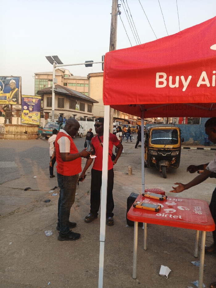 The image depicts a busy street scene in Onitsha, Nigeria, likely a commercial area, with an Airtel mobile service point in the foreground