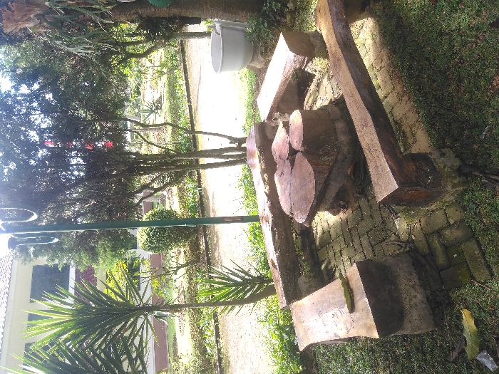 The image depicts an outdoor garden or park environment located in Cipanas, Indonesia. A rustic seating area occupies the foreground and midground, situated on a rectangular base of dark gray interlocking pavers arranged in a herringbone pattern, with visible moss growth in the interstices. The seating unit consists of four benches and a central table, all constructed from large, roughly cut, unvarnished dark brown timber logs. The benches are supported by concrete block bases, while the table is formed from stacked log sections. The paved area is bordered by short, dense green ground cover and scattered brown leaves. Immediately behind the seating, a tall, slender green metal lamp post with a curved arm extends upwards. To the right of the seating arrangement, a large, white, bowl-shaped object, consistent with a planter or basin, rests on the ground. The background is lush with various trees and shrubs, including tall, spiky-leaved plants on the left and denser, dark green foliage further back. A light-colored dirt or gravel path curves through the center-right background. In the upper left background, a two-story building with a light-colored facade and a reddish-brown tiled roof is partially visible. The scene is illuminated by natural daylight, casting shadows. No individuals are present.