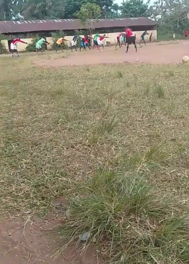group of people playing a game on a field with a building in the background. The people are wearing different colored shirts and shorts. Some of the shirts are green, orange, red, white, and black. They are spread out across the field and appear to be kicking or trying to control a white ball. The field is mostly brown dirt and patchy grass. The building in the background is a long, one-story structure with a corrugated metal roof. There are trees, including palm trees, in the background as well. The camera is positioned low to the ground, near a patch of tall green grass. The sky is overcast. A watermark on the bottom of the screen reads "Shot on AWESOME A50".