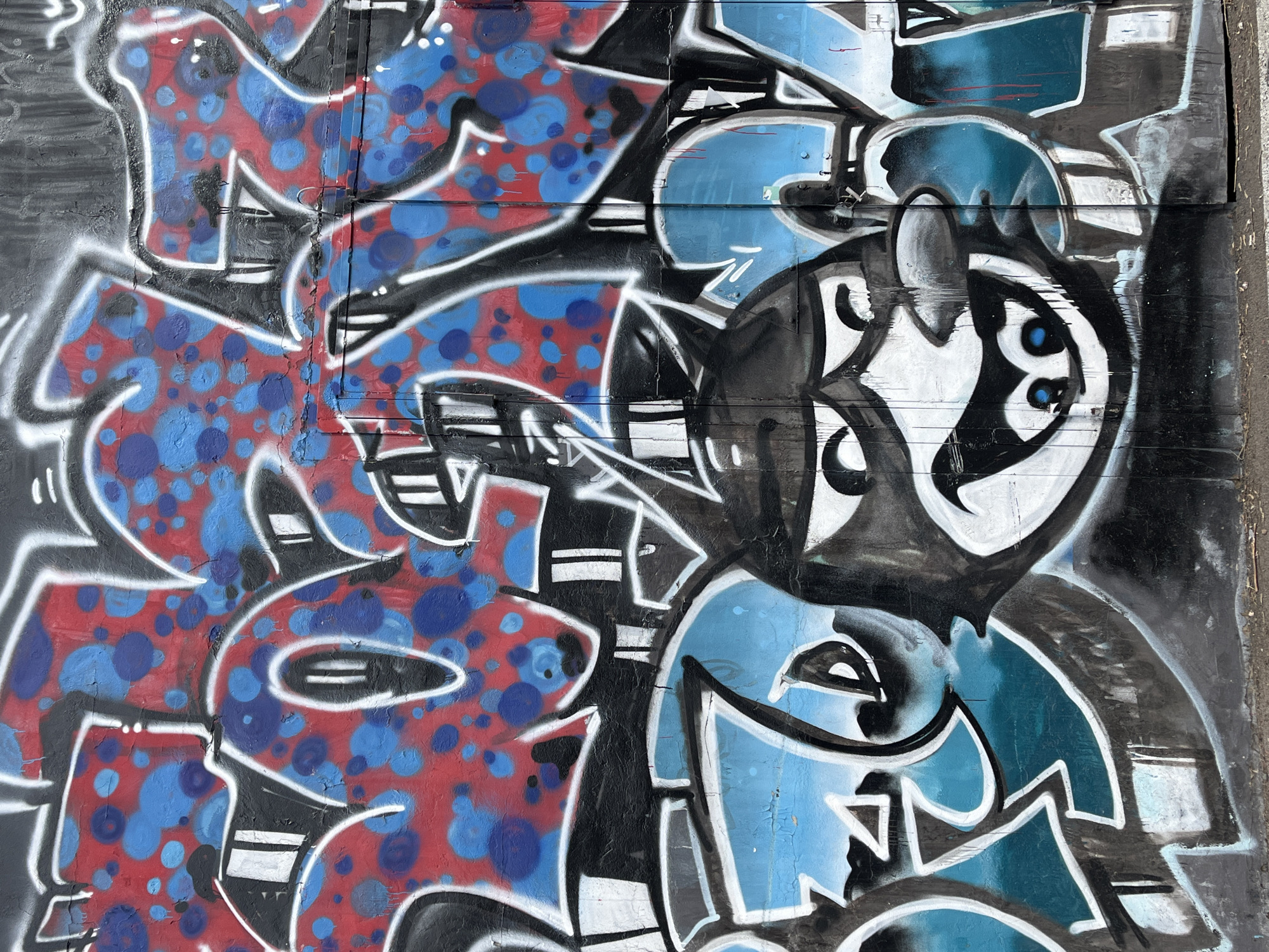 A section of a graffiti-covered wall is depicted in Krasnoyarsk, Russia. The wall features multiple layers of spray paint, with the upper portion dominated by large, stylized block letters filled with a red base color heavily mottled with irregular light blue and darker blue circular patterns. These letters are outlined in thick black with white highlights. Beneath this, additional stylized graffiti letters are rendered in shades of light blue and teal, also outlined in black with white accents. Prominently featured in the lower center of the wall is a cartoon character's head. This character has a wide, smiling expression, large white eyes with distinct blue pupils, a rounded, slightly protruding nose, and a wide-open mouth revealing a white tongue. It possesses pointed ears or a cap-like head covering and is primarily depicted in black with white facial markings, resembling a stylized feline or cartoon animal. The painted surface, which appears to be a textured wall or metal panel, shows visible signs of wear, including paint drips, surface cracks, and minor peeling of the underlying material.